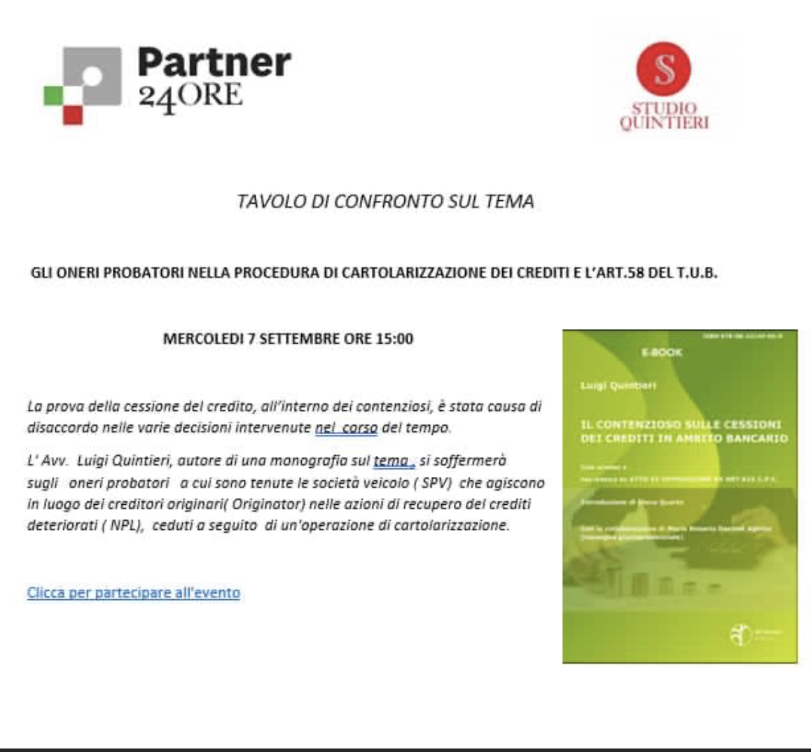 L’Avv. Quintieri relaziona in un webinair in materia di cartolarizzazione dei crediti in ambito bancario, promosso dal Sole 24 ore.